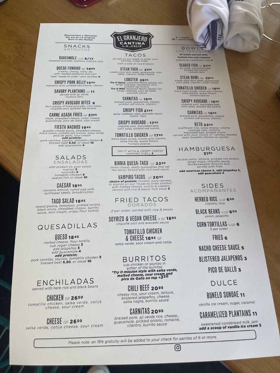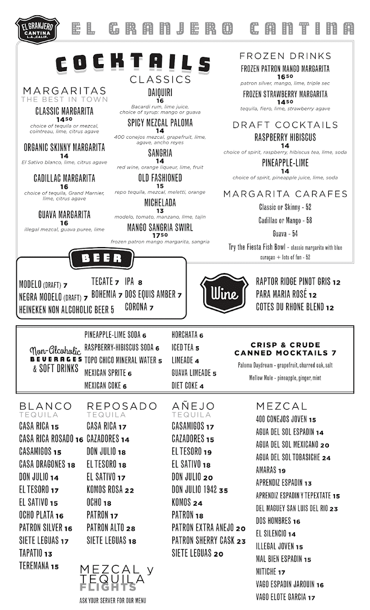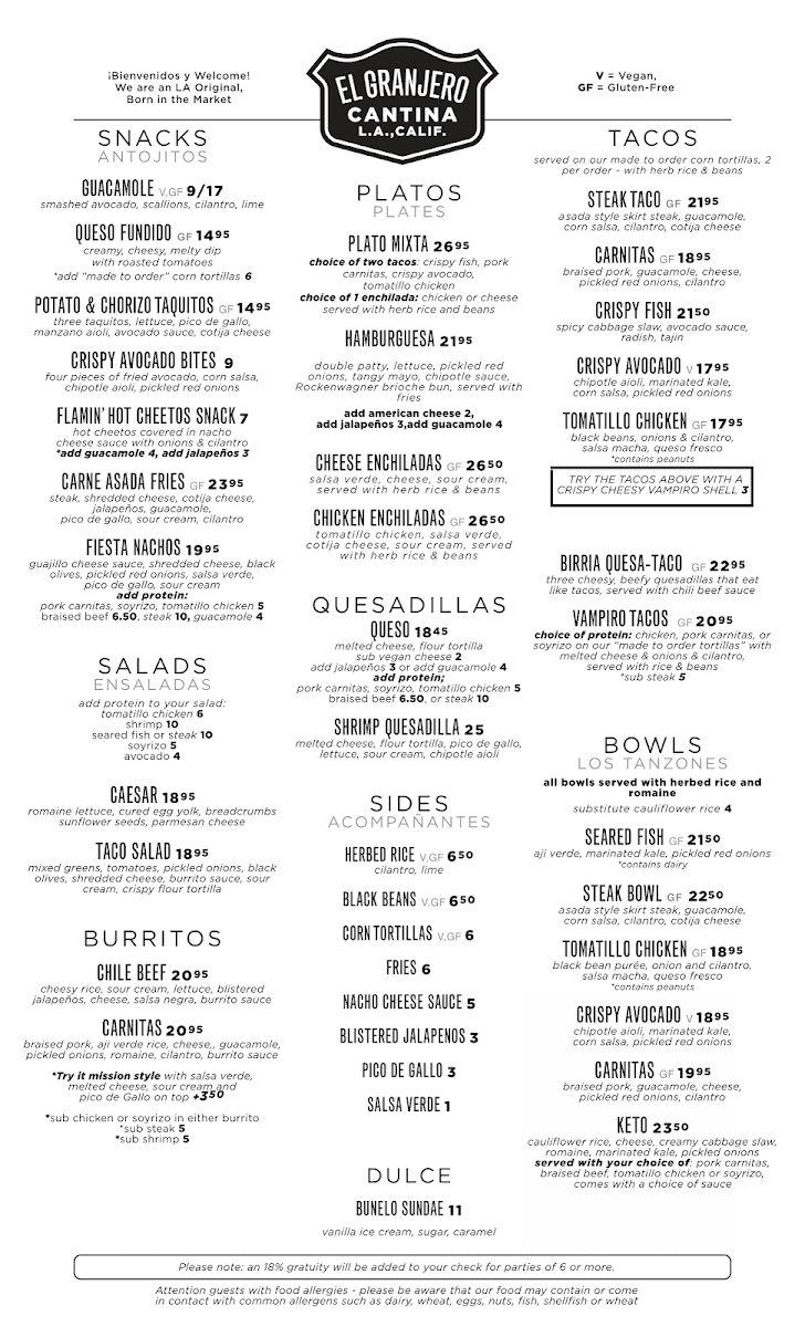 At El Granjero Cantina, we bring the vibrant flavors of Mexican cuisine to Los Angeles with every dish. Whether you're craving sizzling fajitas, flavorful tacos, or a refreshing margarita, El Granjero Cantina Menu has something to satisfy every taste. The menu is a true celebration of authentic Mexican ingredients, with options ranging from classic comfort foods to inventive new dishes that blend traditional flavors with a modern twist. Start your meal with a zesty guacamole or dive straight into our signature burritos and enchiladas. Each bite takes you closer to the heart of Mexico, perfectly paired with hand-crafted cocktails. So, gather your friends, pull up a chair, and let the feast begin - every dish is made to be savored.